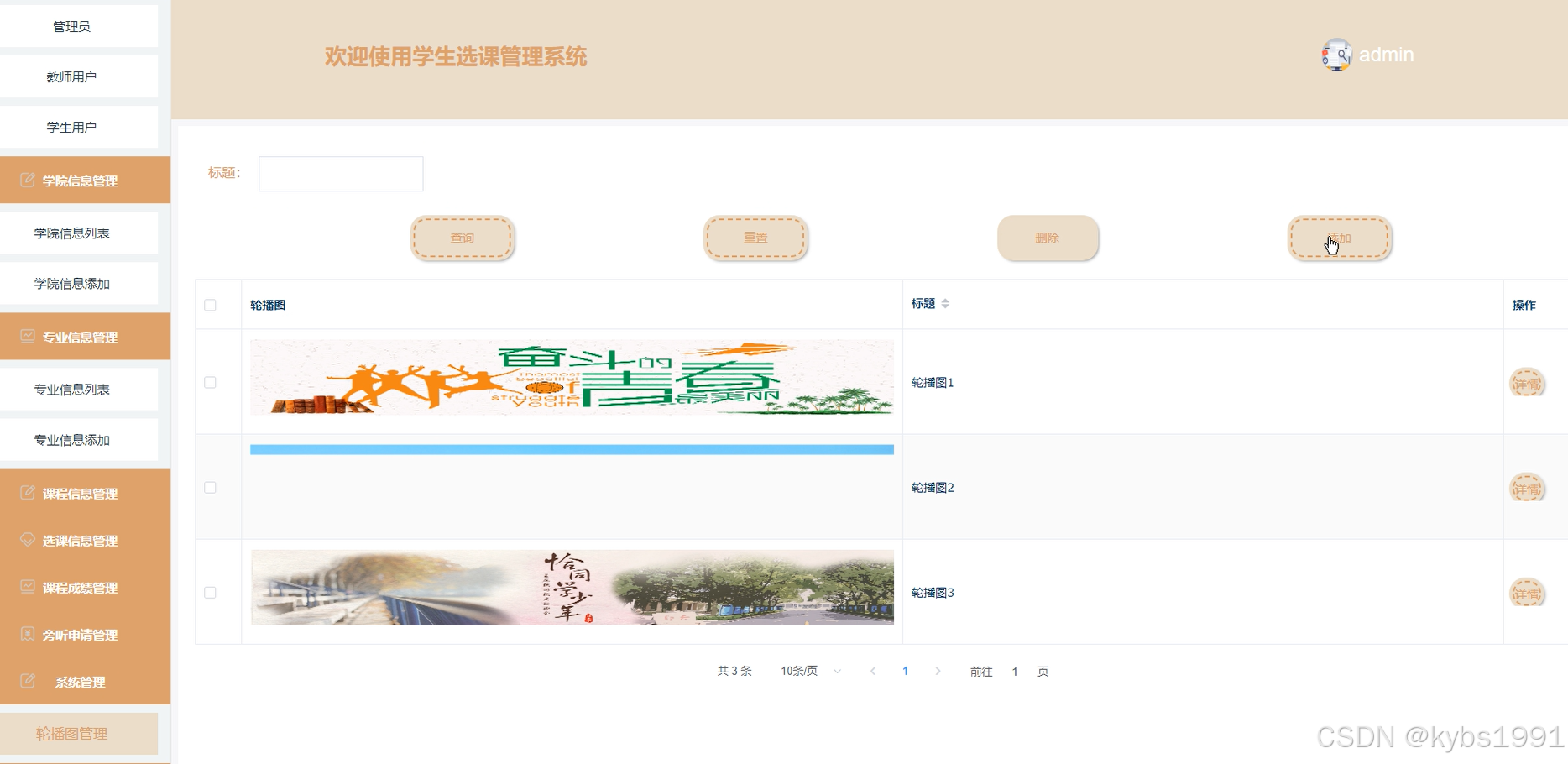 系统管理:可以对轮播图信息,进行查询、删除、添加等操作,如下图所示。