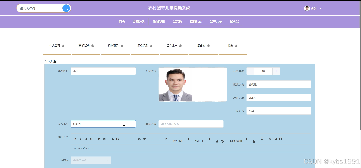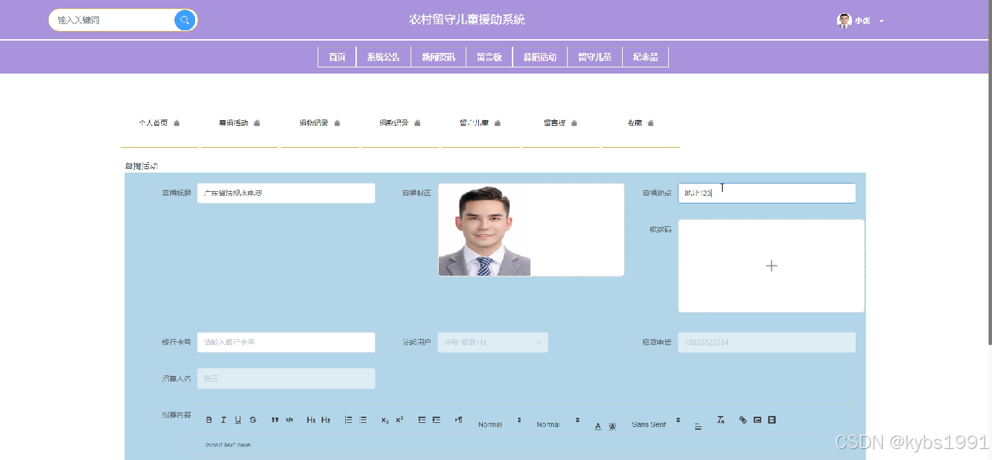 The assistance system for left behind children in rural areas has three roles: administrator, regular user, and recruiting user. The administrator functions include fundraising activity management, donation record management, donation record management, point record management, message guard child management, souvenir management, exchange record management, recharge information management, system management, message management, system announcement management, etc. Therefore, it has certain practicality.