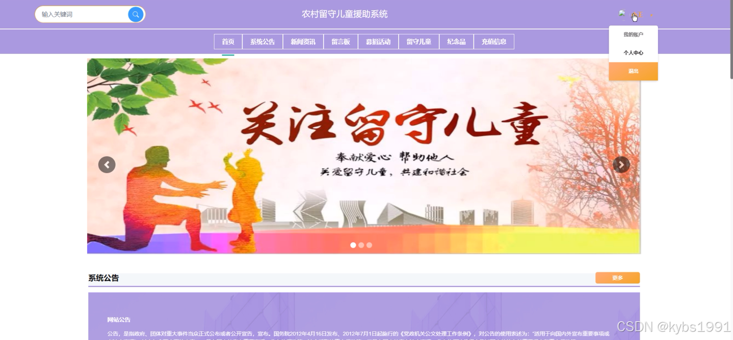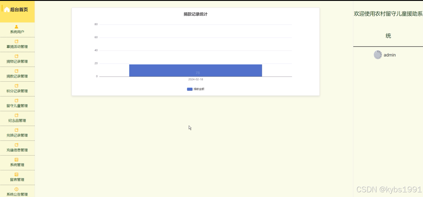 本农村留守儿童援助系统有管理员、普通用户和招募用户三个角色。管理员功能有募捐活动管理、捐款记录管理、捐物记录管理、积分记录管理、留言守儿童管理、纪念品管理、兑换记录管理、充值信息管理、系统管理、留言管理、系统公告管理后等。因而具有一定的实用性。