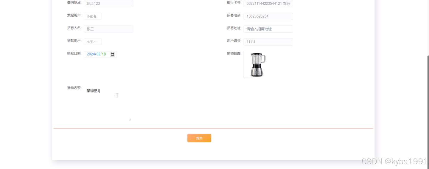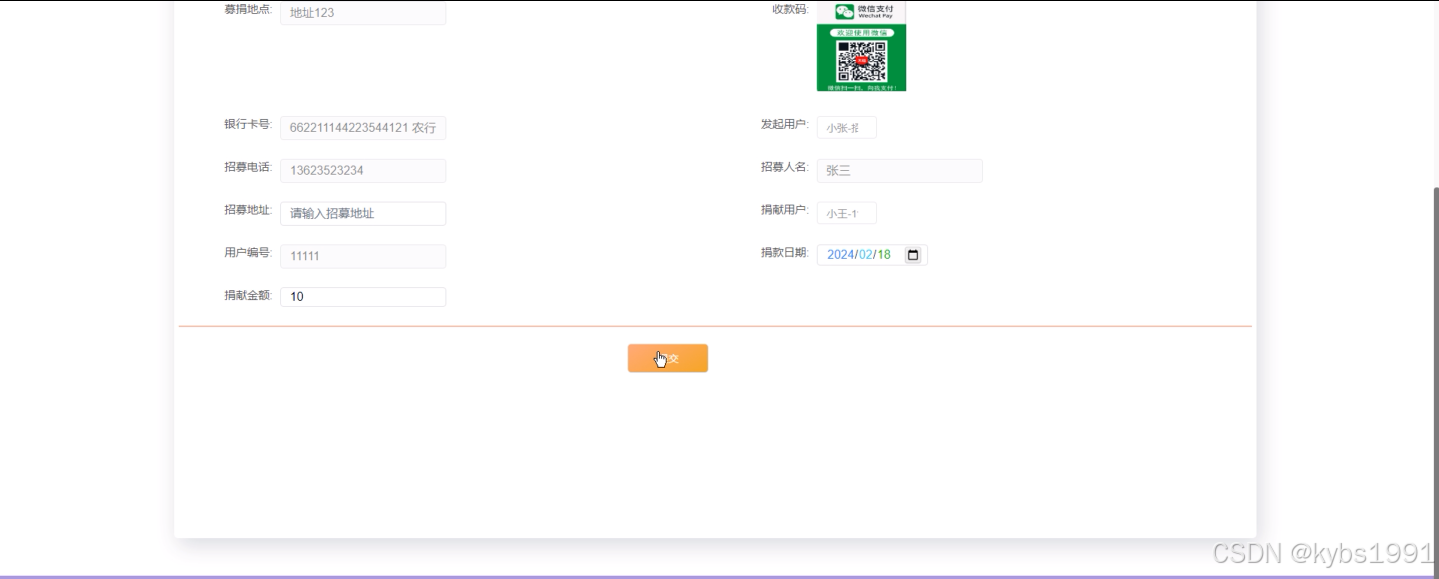 募捐活动,招募用户在“募捐活动”页面可添加募捐标题、募捐封面、地点、收款码、银行卡号、计时标题、计时开始时间、计时结束时间等募捐活动的内容,添加成功后由后台管理员审核通过后才会在前台展示,并可对募捐活动进行重置、查询或删除等操作,如图4-16所示。