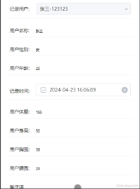 体重记录功能允许用户定期记录自己的体重数据,包括用户的体重、身高、胸围、腰围等信息。用户可以方便地查看自己的体重变化趋势,了解体重管理的效果。同时,平台还提供体重管理建议和目标设定功能,帮助用户制定个性化的体重管理计划,实现理想的体重目标;界面如下图4.6所示。