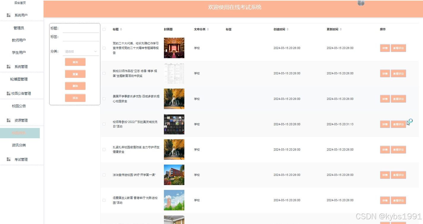 管理员点击“资源管理”菜单能够对其下子菜单校园资讯以及资讯分类进行增删改查,具体的实现界面如下图: