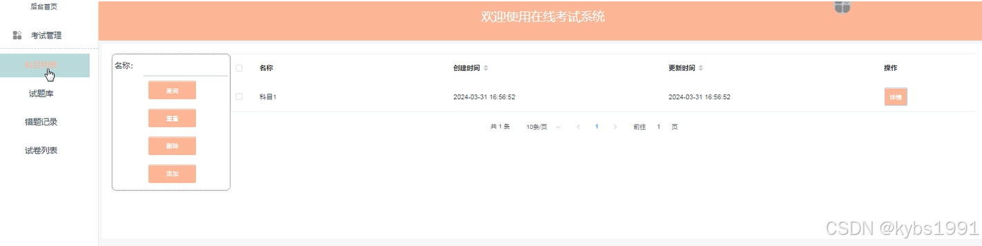 教师点击“考试管理”这一按钮就会展示其下子菜单,选择“科目列表”在这个界面,教师可以对科目信息添加,编辑,删除,具体的实现界面如下图: