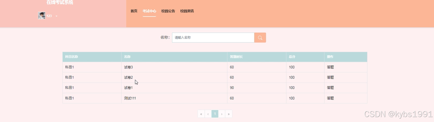 考试中心:用户可以根据考试类型浏览考试题目,并选中某个考试进行在线考试操作,例如:考试名称、答题时长、总分等。