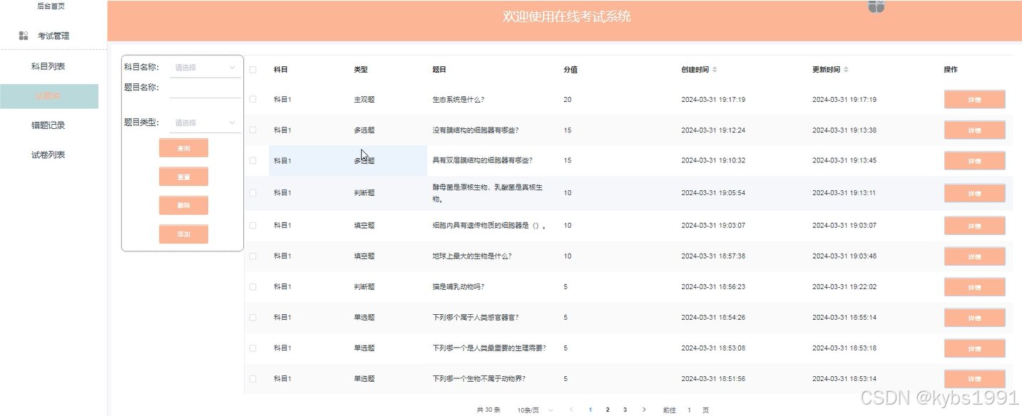 试卷列表:对试卷进行增删改查。