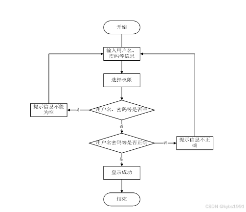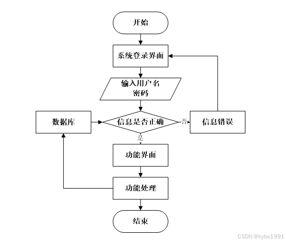 用户打开并进入系统后,会先显示登录界面,输入正确的用户名和密码,系统自动检测信息,若信息无误,则用户会进入系统功能界面,进行操作,否则会提示错误无法登录,操作流程如图2-5所示。