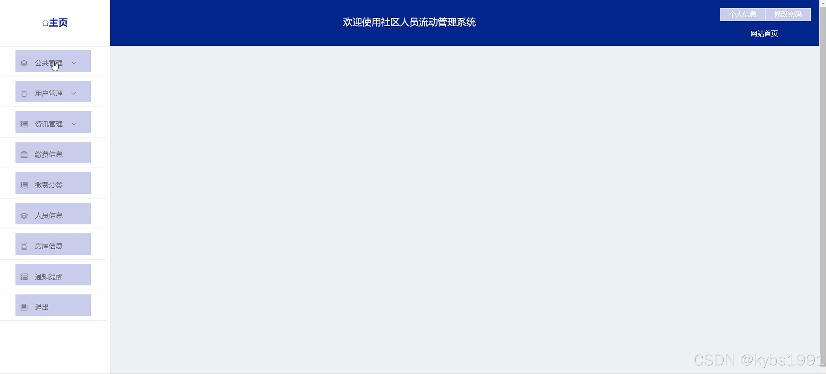 管理员登录进入社区人员流动管理系统可以查看主页、公共管理、用户管理、资讯管理、缴费信息、缴费分类、人员信息、房屋信息、通知提醒等信息。在功能界面还可以查看人员信息统计和房屋信息统计。首页界面如下图所示。
