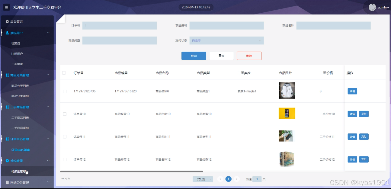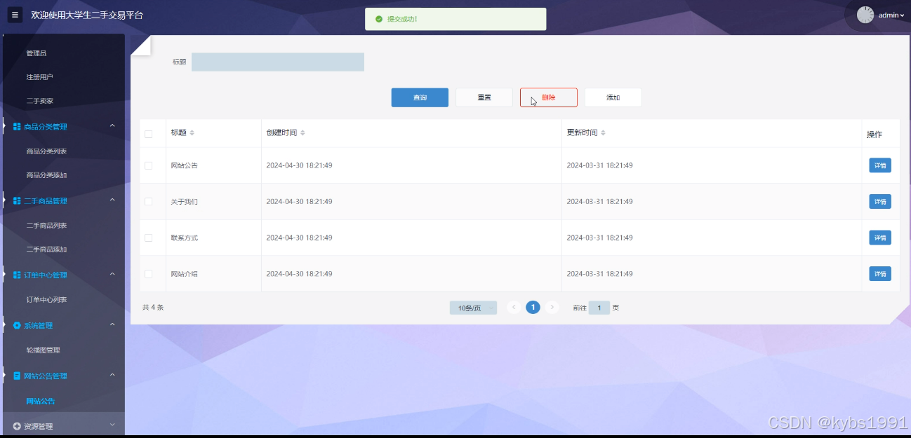 (5)二手商品管理:点击“二手商品管理”这个菜单,可以查看到二手商品,进行查询,添加、删除等操作。