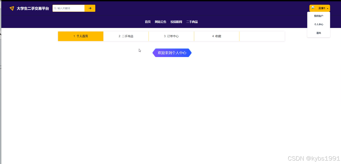 通过卖家能页面,可以查看首页、网站公告、校园新闻、二手商品、我的账户、个人中心(个人首页、二手商品、订单中心、收藏)等,并且可以根据需要进行相应的操作,界面如下图4-10所示。