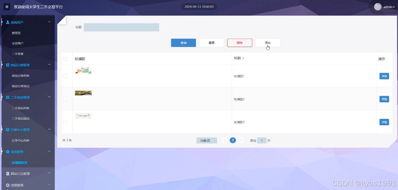 管理员可以对轮播图进行提交,还可以进行查询、重置、删除、添加等操作。界面如下图4-9所示。
