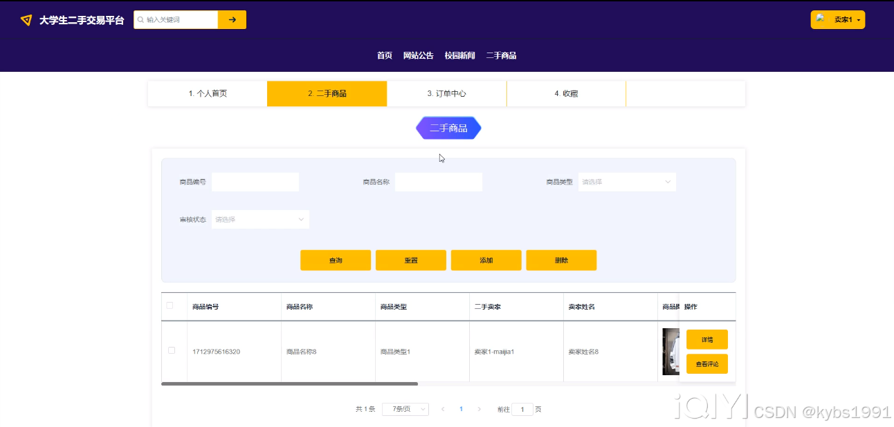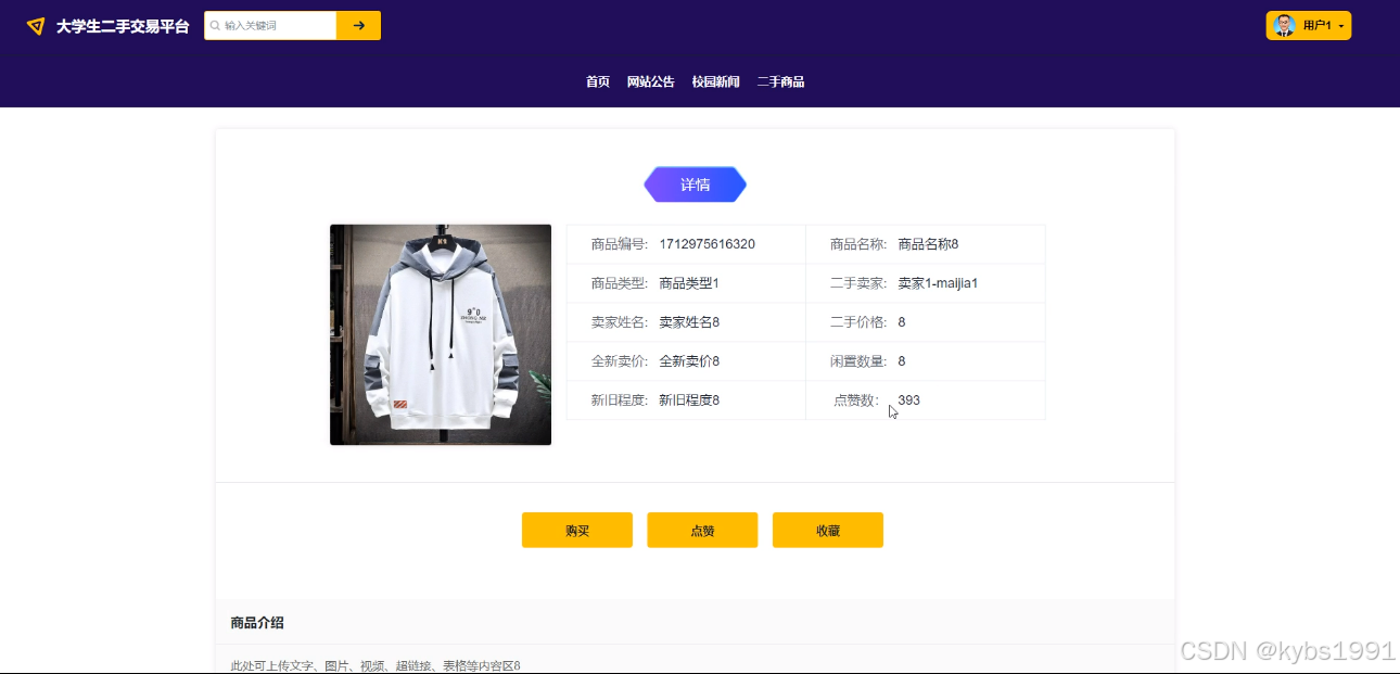 (4)二手商品:点击“二手商品”这个菜单,可以查看到系统中所有添加的二手商品,支持通过关键词进行查询,如果想要了解某一二手商品的详细信息,点击后面的“详情”会进入详情查看界面,可以对二手商品进行添加购买、收藏、评论等操作;