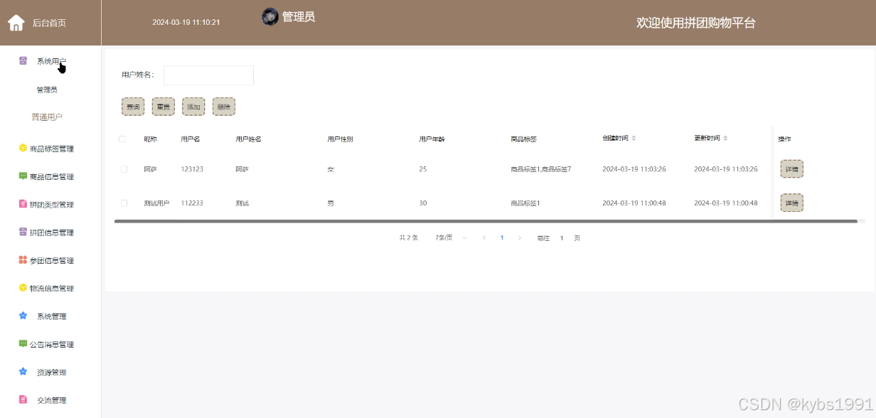 (2)系统用户:管理员可以对拼团购物平台中的管理员和普通用户进行增删改查。