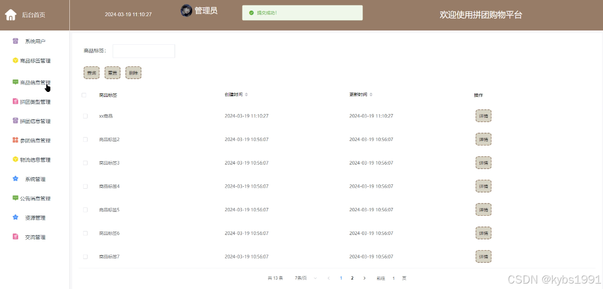 (6)拼团信息管理:管理员点击“拼团信息管理”菜单可以对拼团信息列表进行查看,并进行增删改查。如果想要添加新的拼团信息,点击“添加”按钮,输入拼团信息详情信息,点击“提交”按钮就可以添加了。