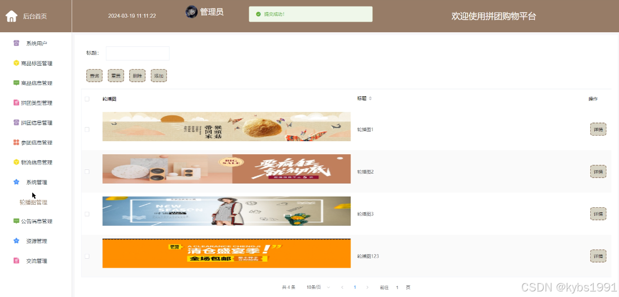 管理人员在“系统管理”这一菜单下是可以对拼团购物平台内的轮播图进行添加修改的,其管理界面如下图4-12所示。