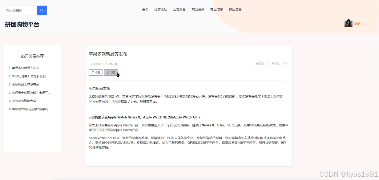 (5)商品资讯:点击“商品资讯”这个菜单,可以查看到系统中所有添加的商品资讯,如果想要了解某一新闻信息的详细信息,点击后面的“详情”会进入详情查看界面,可以对商品资讯信息进行详情查看、点赞、收藏、评论等操作。