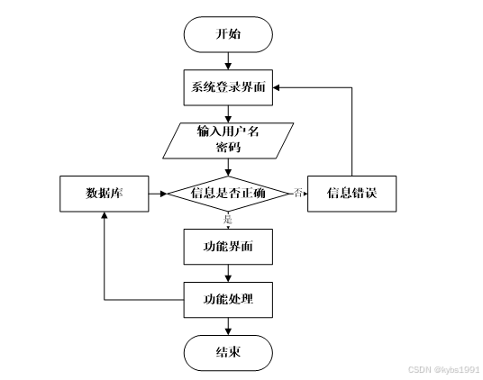 用户打开并进入系统后,会先显示登录界面,输入正确的用户名和密码,系统自动检测信息,若信息无误,则用户会进入系统功能界面,进行操作,否则会提示错误无法登录,操作流程如图2-3所示。