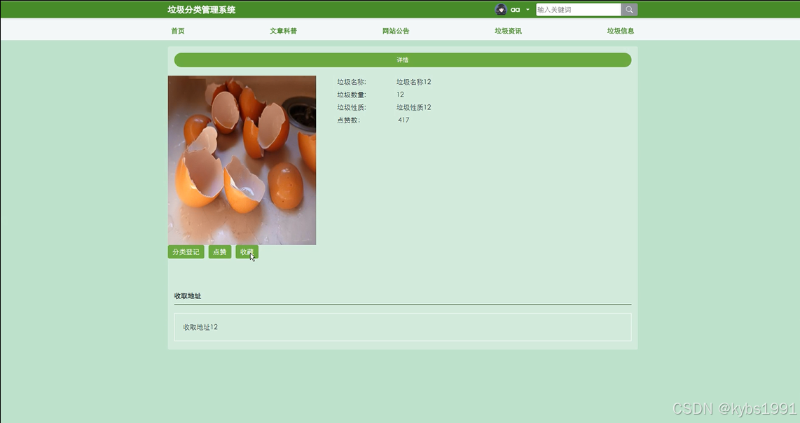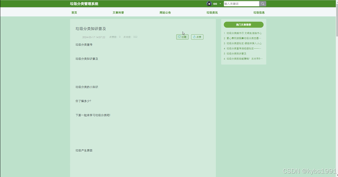 用户点击系统首页导航栏上的“垃圾信息”后,用户可以查看各种垃圾的分类信息和处理方法,以便正确投放垃圾,可以进行点赞、收藏、评论等操作。页面如图4-4所示。