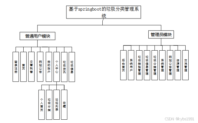 按照基于springboot的垃圾分类管理系统的角色,系统划分为了普通用户模块和管理员模块这两大部分。