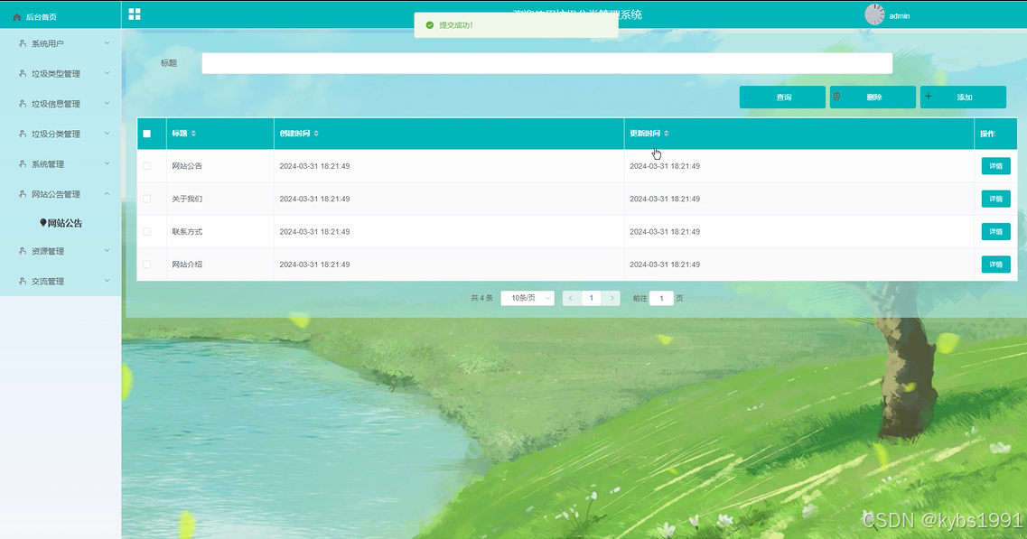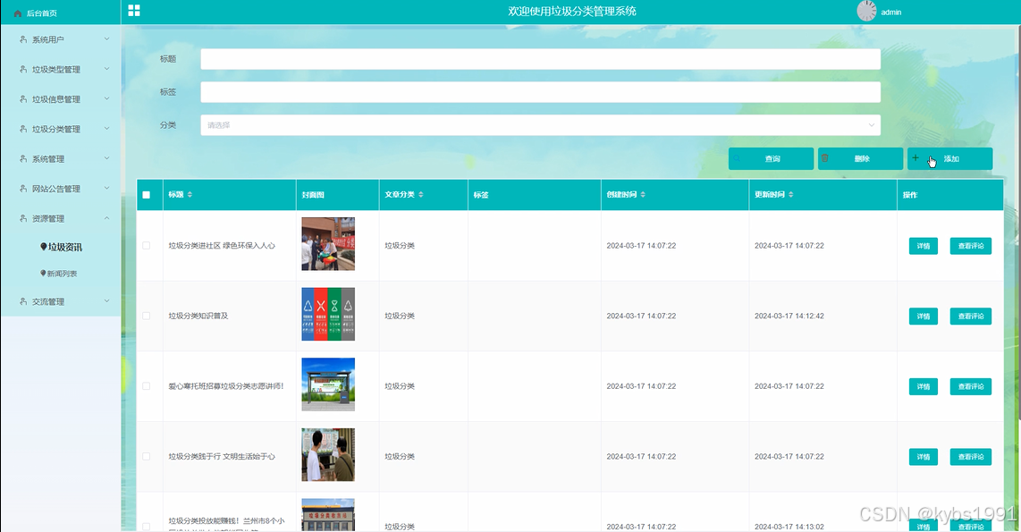 当管理员点击“资源管理”这一菜单的时候,会出现垃圾资讯+资讯分类这两个子菜单,可以对这两个模块进行增删改查操作。资源管理界面如下图所示。