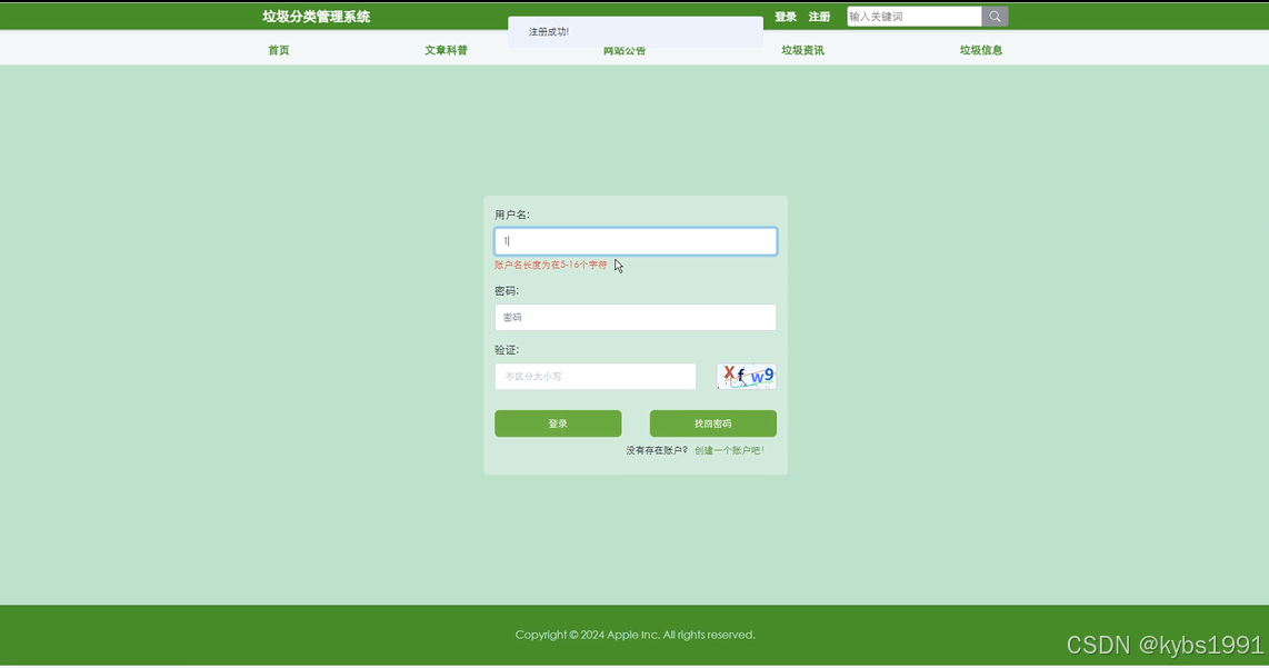 基于springboot的垃圾分类管理系统中的注册后的用户是可以通过自己的账户名和密码进行登录的,当用户输入完整的自己的账户名和密码信息并点击“登录”按钮后,将会首先验证输入的有没有空数据,再次验证输入的账户名+密码和数据库中当前保存的用户信息是否一致,只有在一致后将会登录成功并自动跳转到基于springboot的垃圾分类管理系统的首页中;否则将会提示相应错误信息,用户登录界面如下图4-2所示。