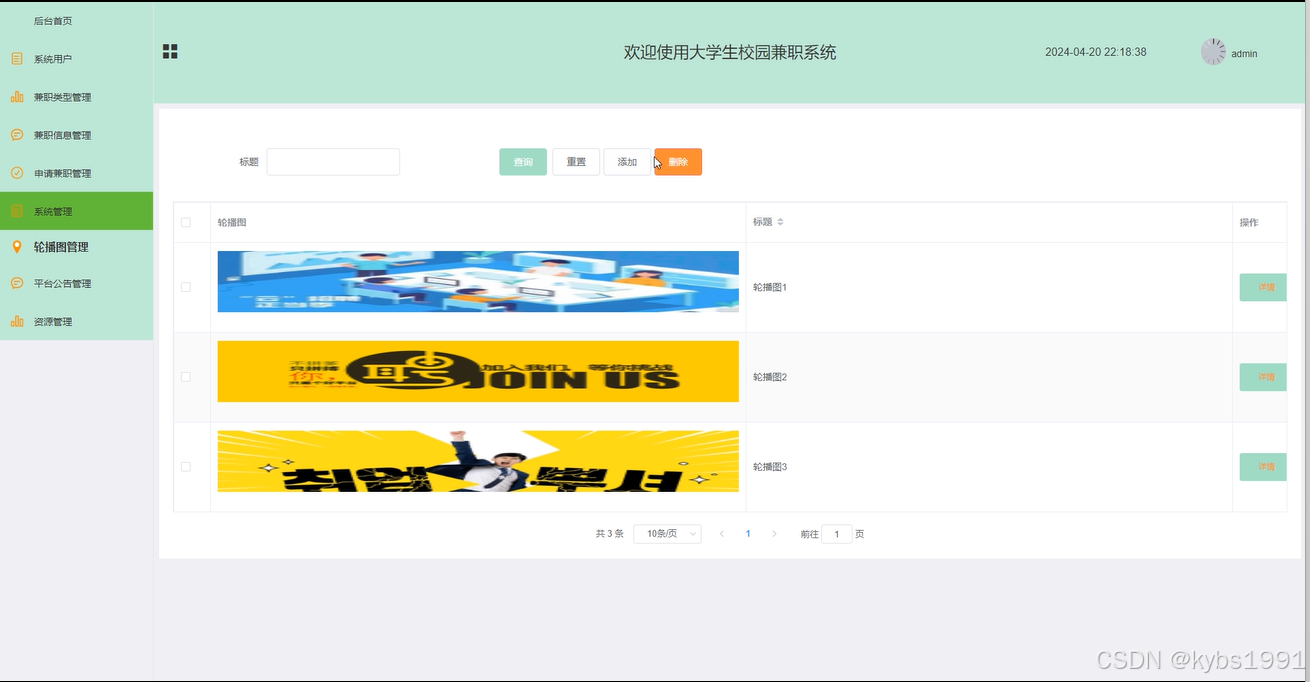 6.系统管理:管理员可以管理系统的轮播图,具备增删改查和查看详情的功能。这有助于维护系统界面的美观和信息的及时更新。