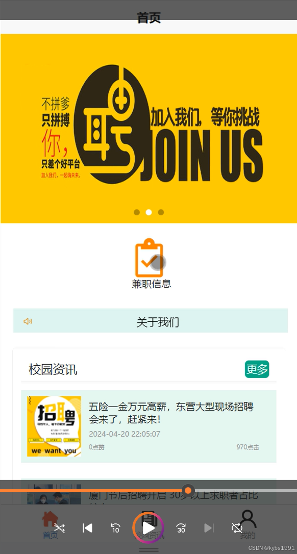 2.首页:学生用户访问首页时,可以直观看到轮播图,快速了解平台动态。同时,他们可以浏览兼职信息,寻找合适的兼职岗位。此外,学生用户还能查看网站公告,了解平台最新动态,以及浏览校园资讯,获取学校及周边的新鲜事。