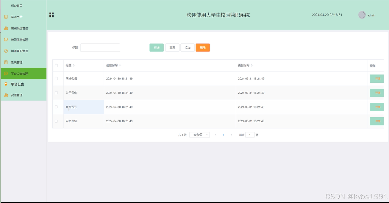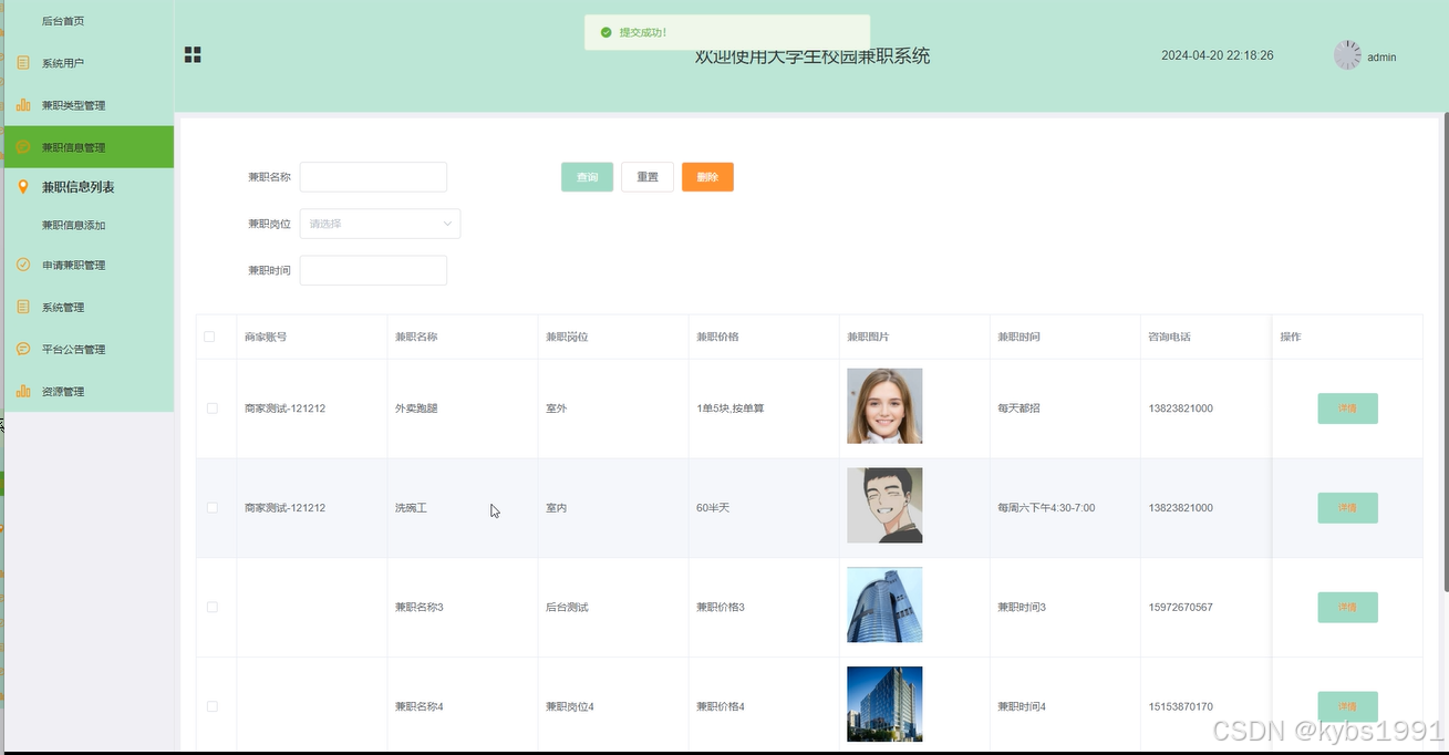 管理员可以管理兼职信息,包括添加新兼职、查看兼职详情、查询特定兼职以及重置和删除兼职信息。管理员还可以通过兼职名称、兼职岗位和时间进行搜索,提高信息管理效率。