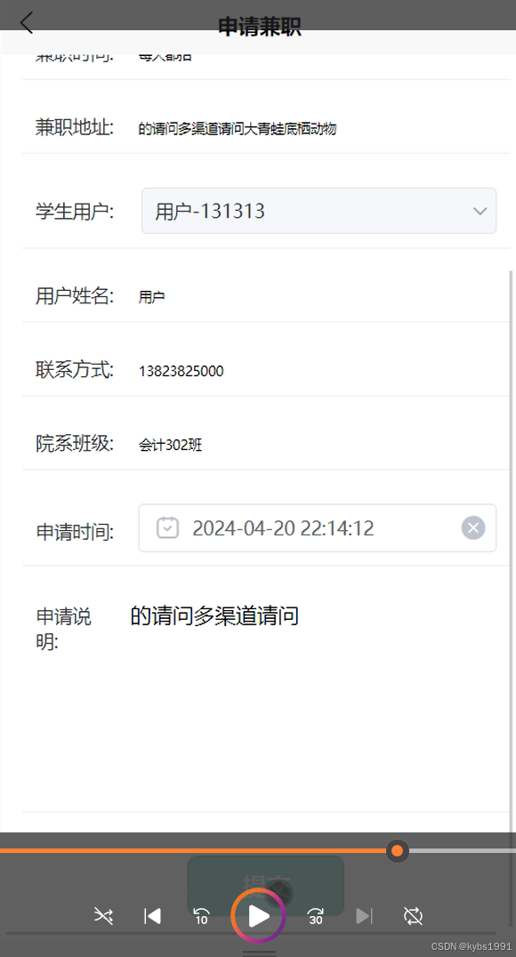 5.申请兼职管理:管理员可以管理申请兼职的列表,包括查看详情、查询特定申请、重置和删除申请。同时,通过兼职名称、兼职岗位、兼职时间和审核状态进行搜索,以便及时处理和审核用户申请。