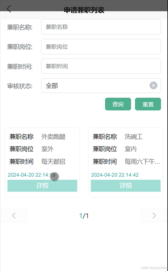 9.兼职申请:在此板块,学生用户可以查看自己申请的所有兼职,包括兼职名称、岗位、时间等信息。他们可以通过不同条件进行搜索,并等待商家用户的审核结果。