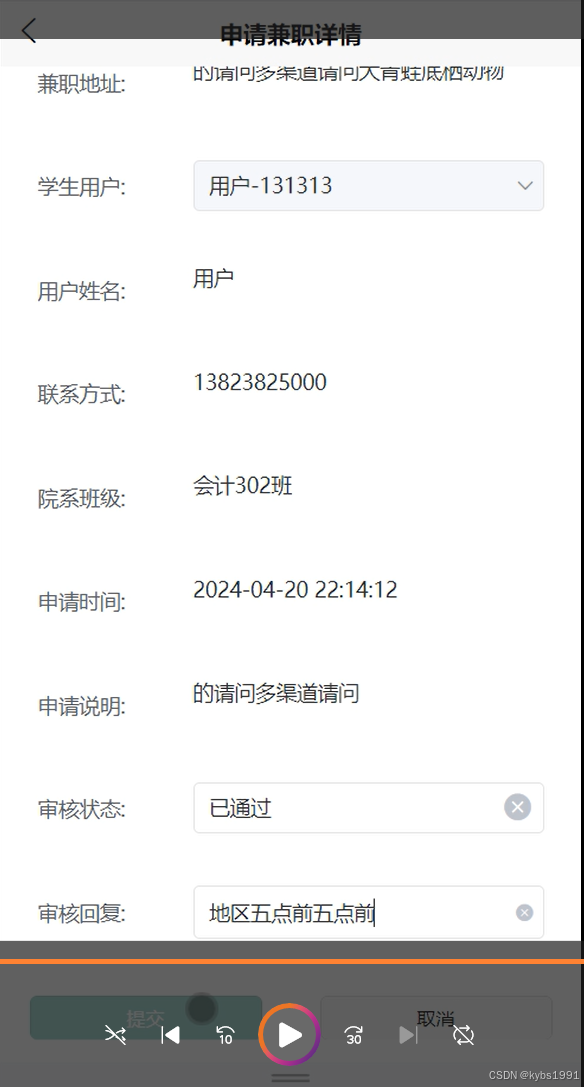 “申请兼职”部分是商家用户管理学生用户兼职申请的核心区域。在这里,用户可以查看所有申请兼职的列表详情,包括申请者的信息、申请的兼职岗位等。用户还可以根据兼职名称、岗位、时间和审核状态进行搜索,以快速定位到特定的申请。最重要的是,商家用户可以对这些申请进行审核,并给出明确的回复,确保招聘流程的高效和透明。