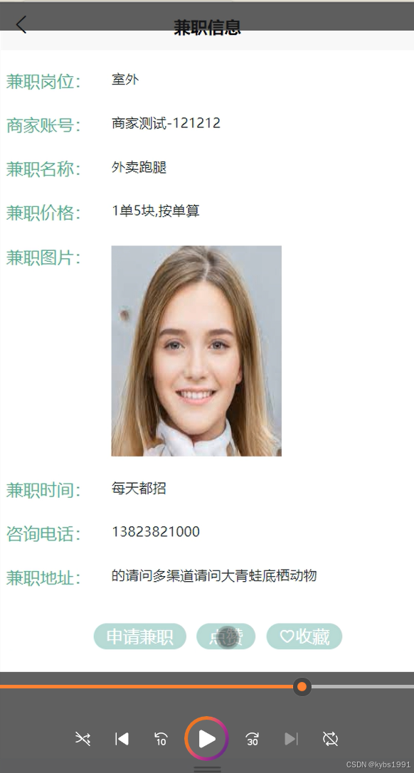 3.兼职信息:在兼职信息板块,学生用户可以查看丰富的兼职信息列表,包括兼职名称、岗位等。他们可以根据兼职名称或时间进行搜索,也可以直接选择特定的兼职岗位进行筛选。对于感兴趣的兼职,他们可以点赞、收藏,甚至直接在线申请。