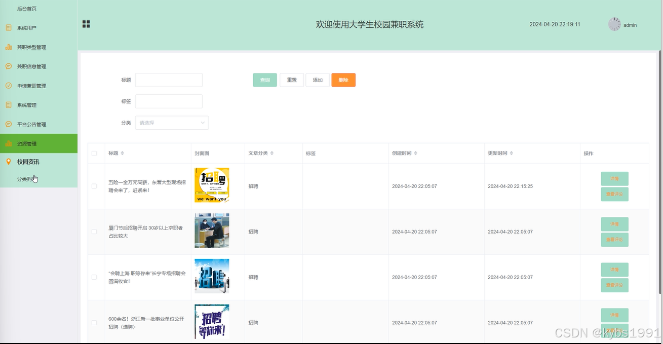 管理员点击“资源管理”菜单能够对大学生校园兼职系统内的校园资讯、分类列表进行增删改查。