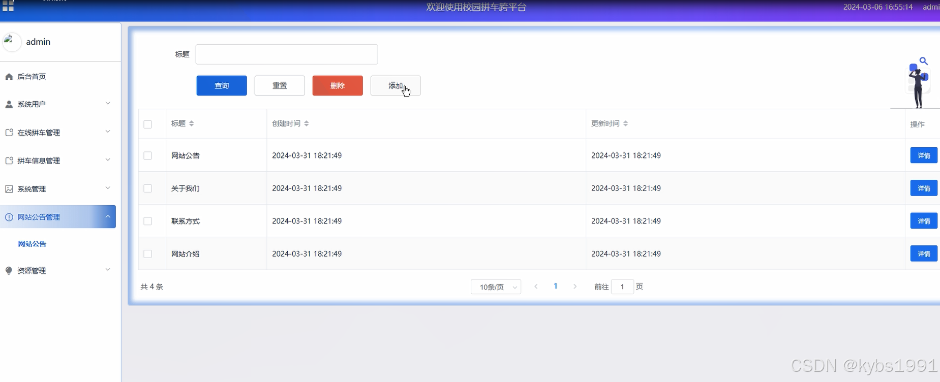 点击“网站公告管理”这个菜单,可以查看到系统中所有添加的系统公告,支持通过标题对系统公告进行查询,添加、删除等操作。网站公告管理界面如下图所示。