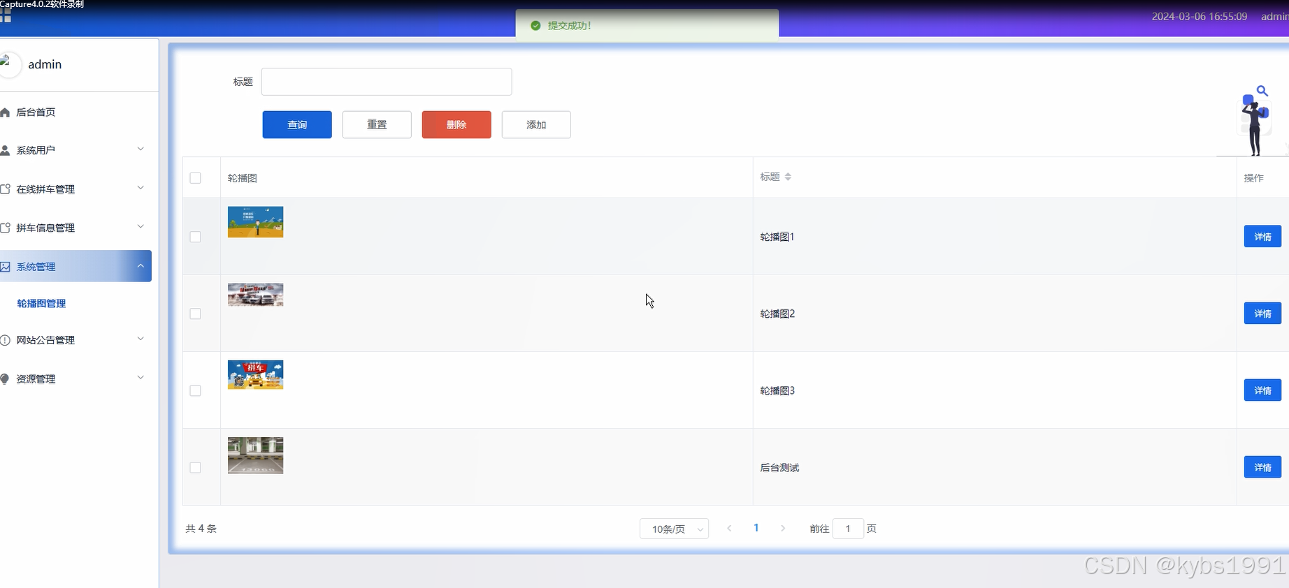管理员可以对系统前台展示的轮播图进行增删改查,方便用户进行查看。轮播图管理界面如下图所示。