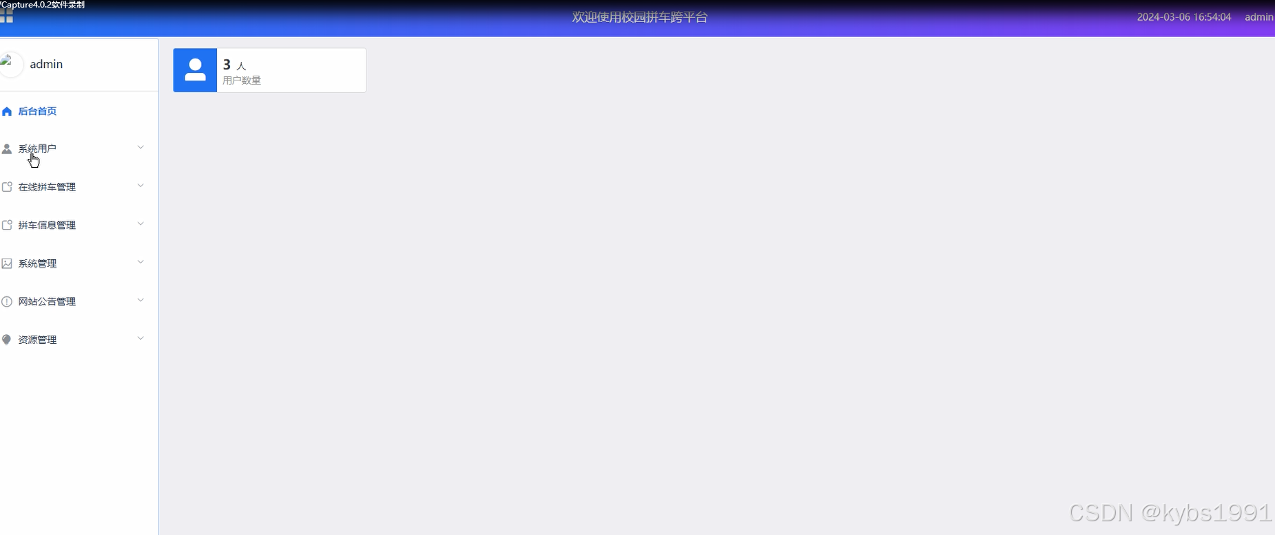 管理员可以查看后台后台首页、系统用户、在线拼车管理、拼车信息管理、系统管理(轮播图)、网站公告管理、资源管理(拼车资讯、新闻列表)等,并且可以根据需要进行相应的操作,管理员功能界面如下图所示。