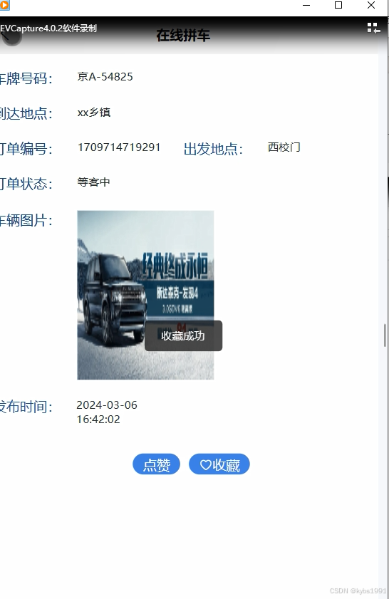 当点击“在线拼车”这一菜单的时候,可以查看车牌号码、到达地点、订单编号、订单状态、车辆图片、发布时间等信息,可以进行点赞和收藏。在线拼车界面如下图所示。