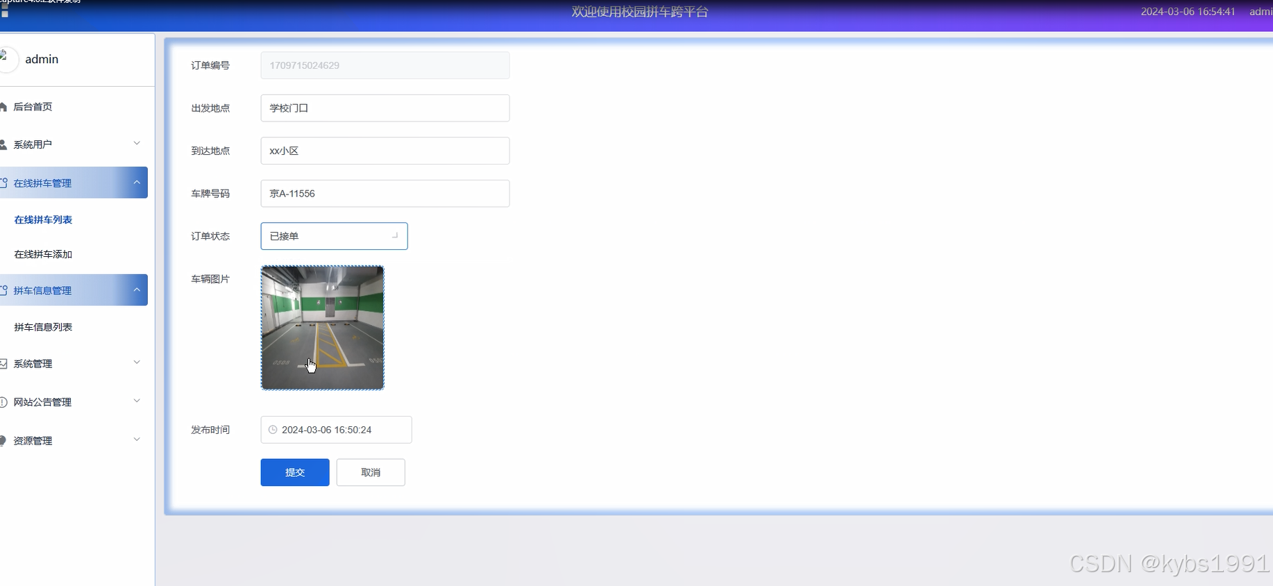 点击“在线拼车管理”这一菜单的时候,会出现在线拼车列表、在线拼车添加这两个子菜单,可以对这两个模块进行增删改查等操作,在线拼车列表、在线拼车添加界面如下图所示。