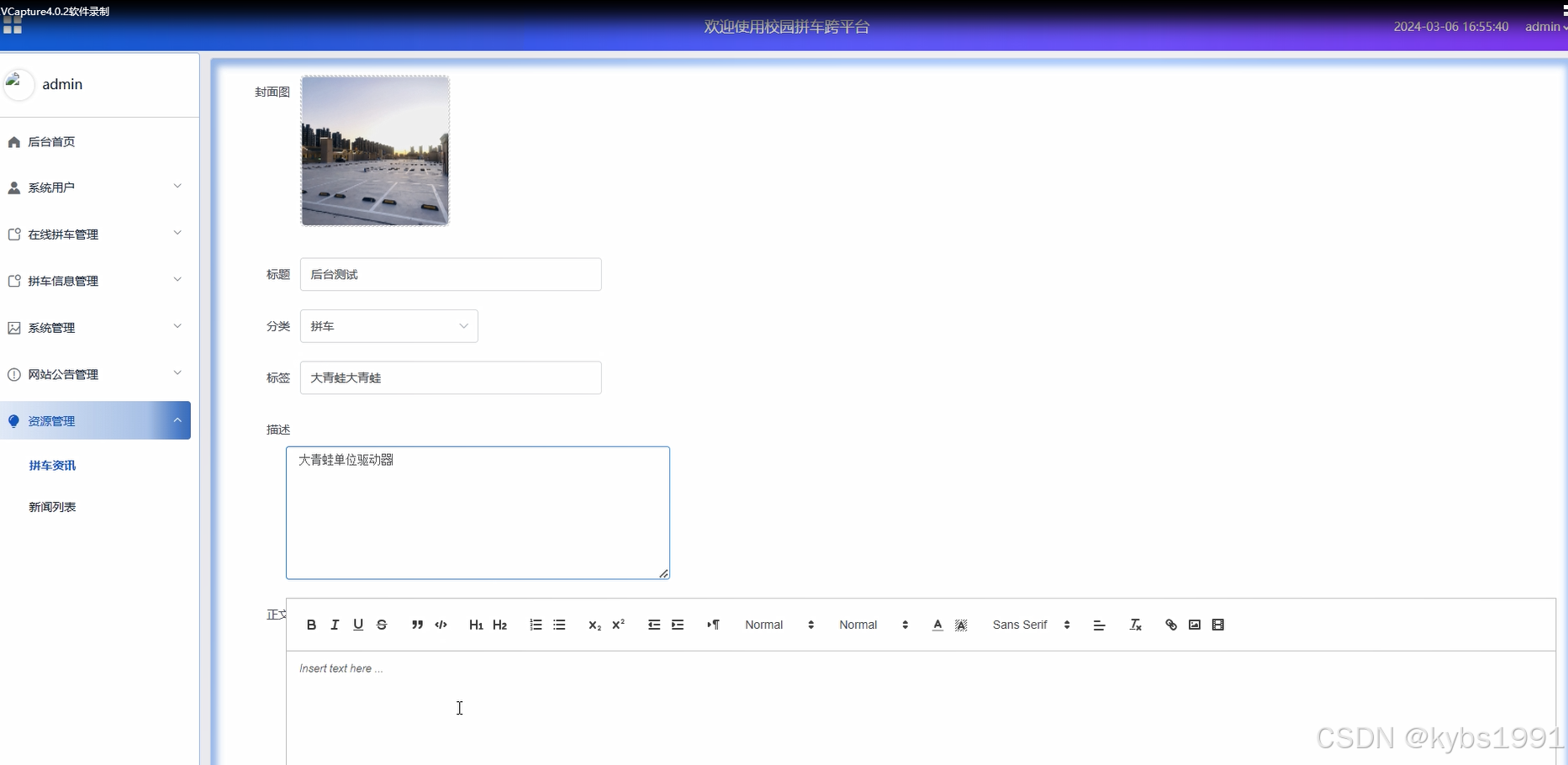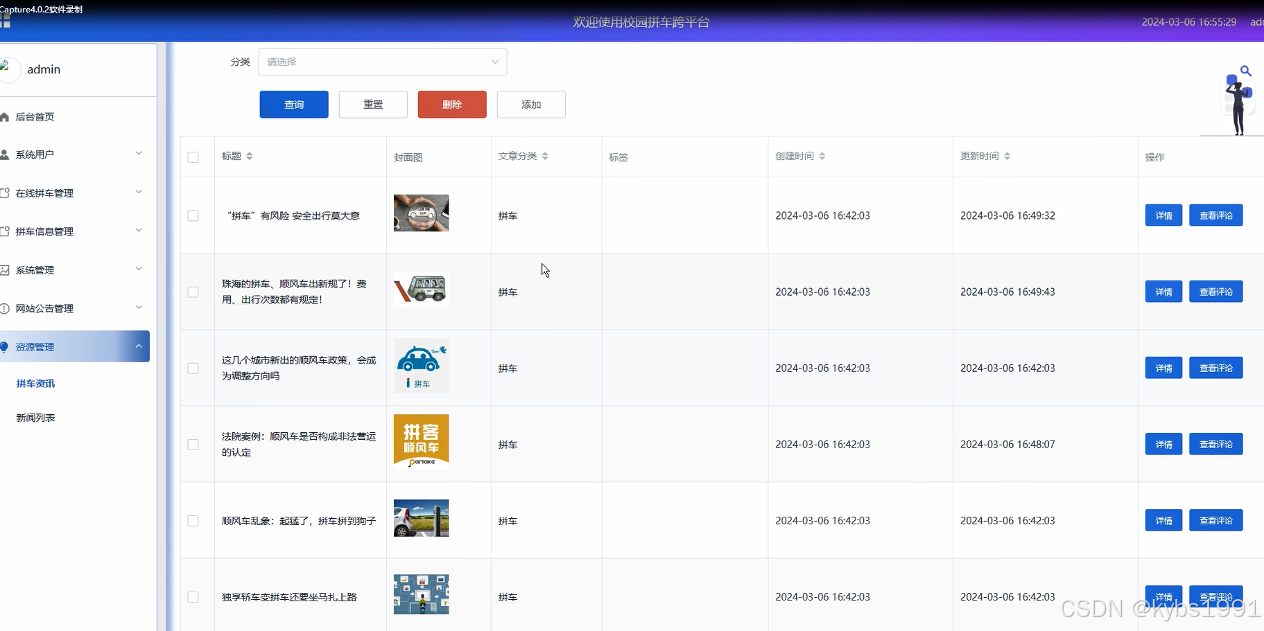 点击“资源管理”这一菜单的时候,会出现拼车资讯、新闻列表这两个子菜单,可以对这两个模块进行增删改查等操作,拼车资讯、新闻列表界面如下图所示。