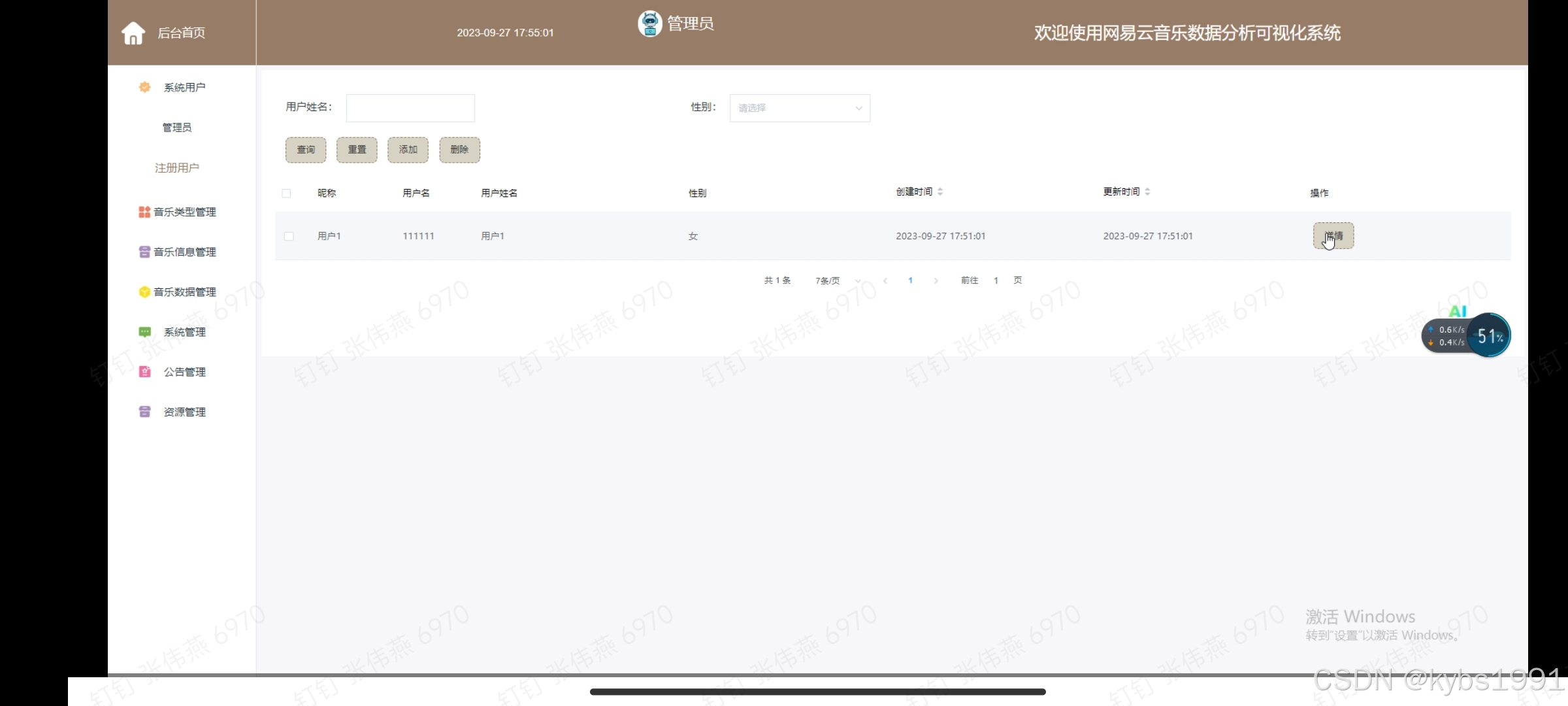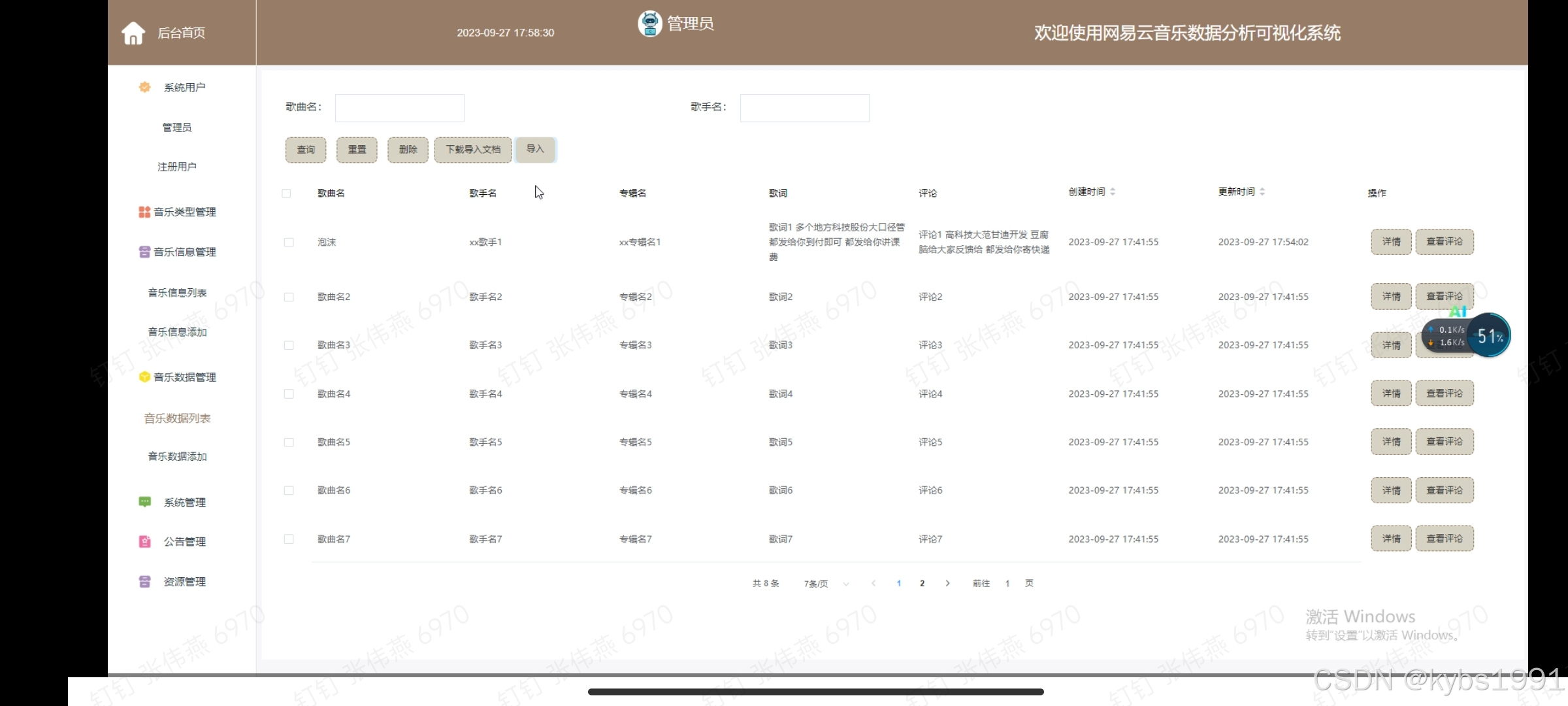 在本次网易云音乐数据分析可视化系统中,利用了目前市场上普遍使用的Python技术,以及数据库管理功能MySQL,和目前比较流行的Django框架,以现实生活的音乐数据分析可视化过程为标准,设计实现了系统用户、音乐类型管理、音乐信息管理、音乐数据管理、系统管理、公告管理、资源管理等功能,并维护好后台的信息和整体系统的稳定性。
