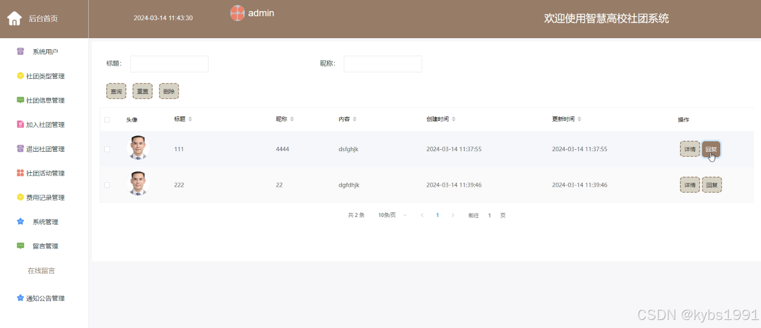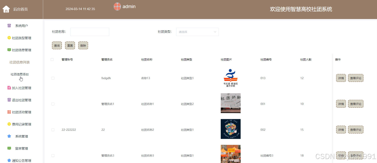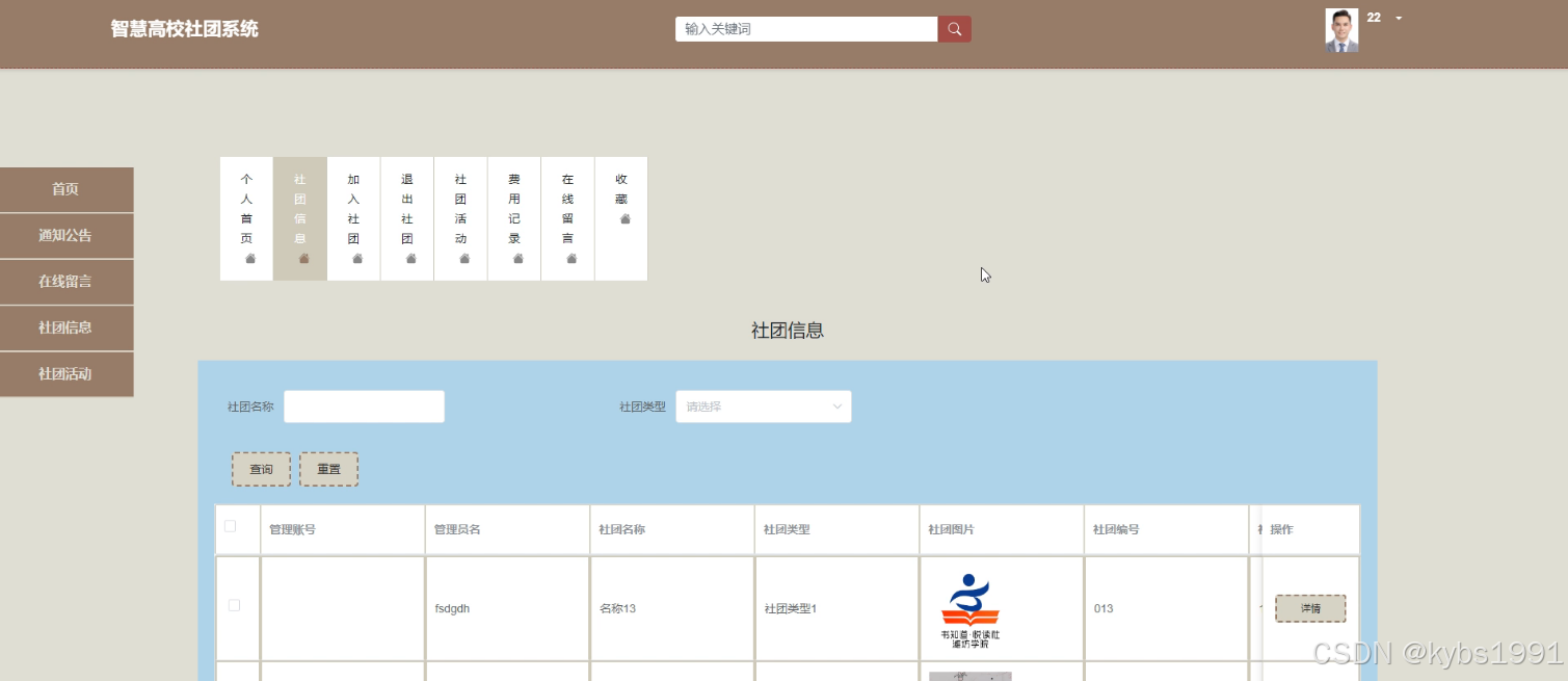 The system adopts B / S architecture, combining the SpringBoot framework and MYSQL database to ensure the stability, security and scalability of the system. Through the front-end interactive interface, the functions of club information display, release and management of club activities, registration and login of club members are realized. The back end is responsible for processing data logic, including the storage, query, updating and deletion of community information.
