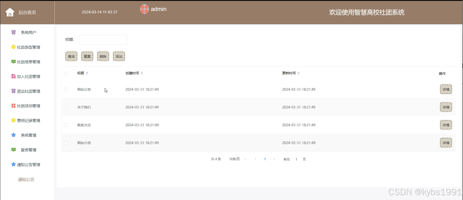 通知公告管理,管理员可以对通知公告信息进行维护管理。如图4-12所示。