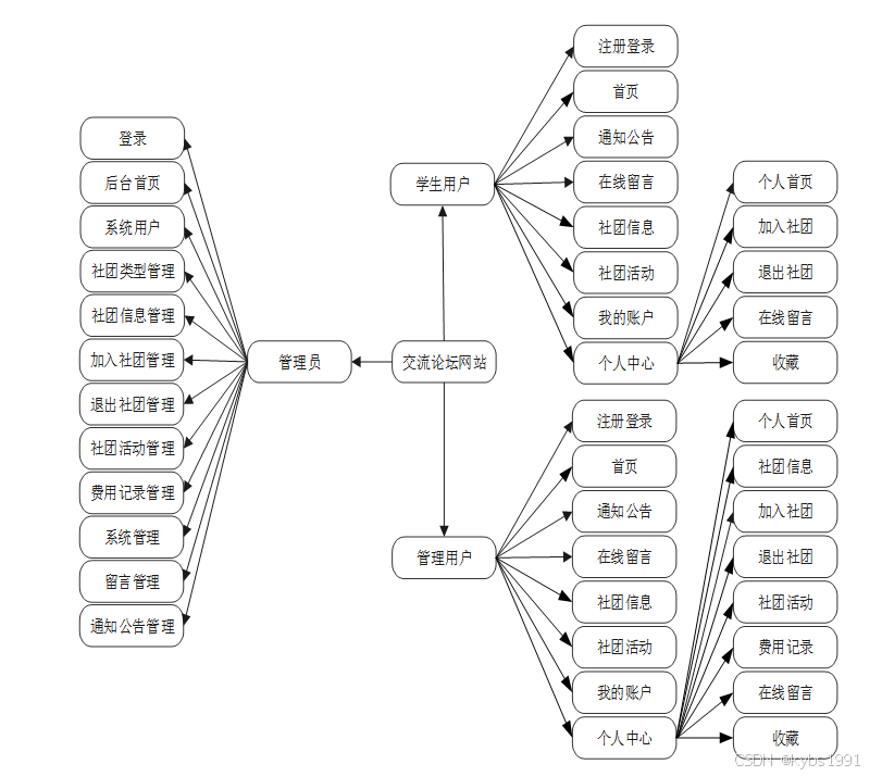 (3)确定好系统使用的技术,进行在线确认系统所划分的用户角色,并且根据用户角色划分确定所要设计的功能模块,对智慧高校社团系统的设计主要划分别为管理员和用户角色,并所使用的功能模块也相应不同,但是系统的数据库实现的内容是交互的,用户可以随时根据自己的需求进行论坛交流,对于系统工作人员可以根据自己的分管内容进行在线信息的处理及操作,管理员获取到所有用户的详细数据信息,并根据需求进行第一时间处理解决。