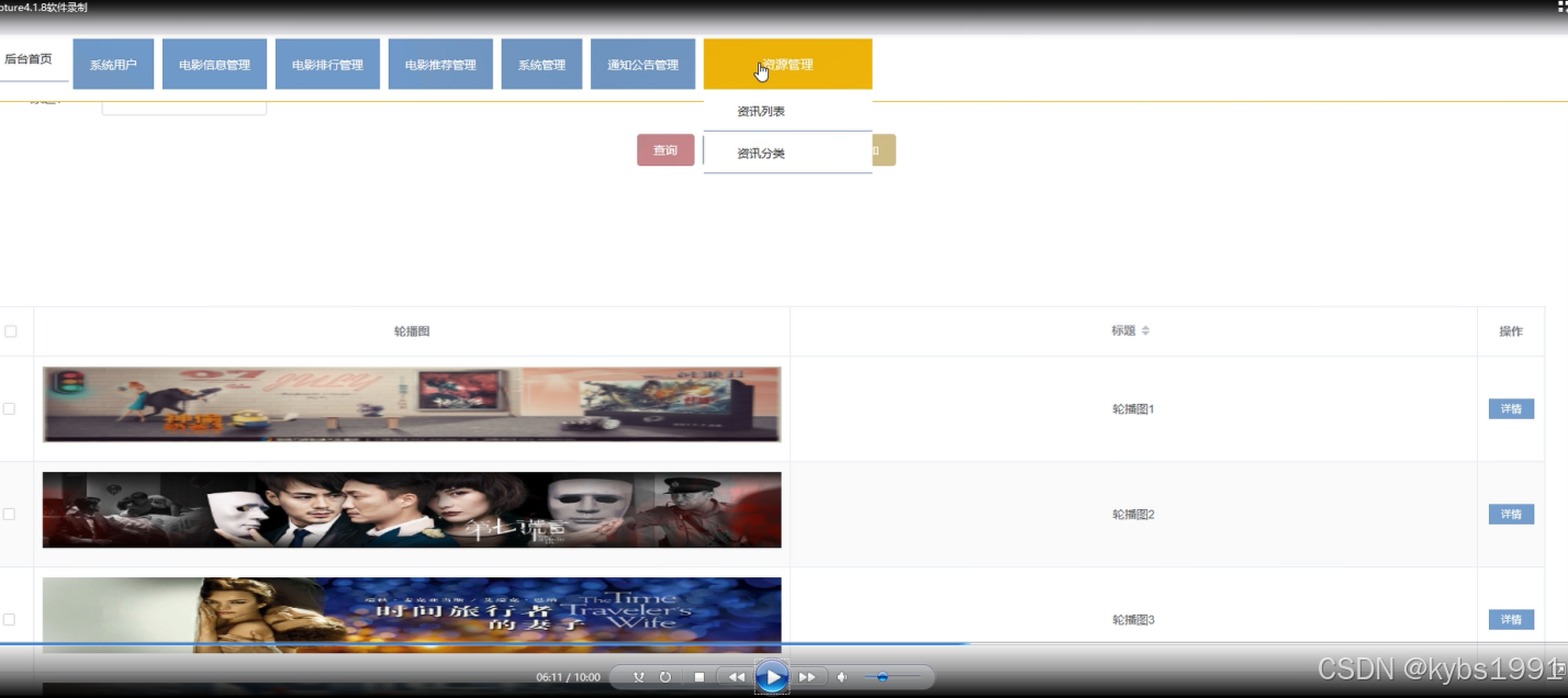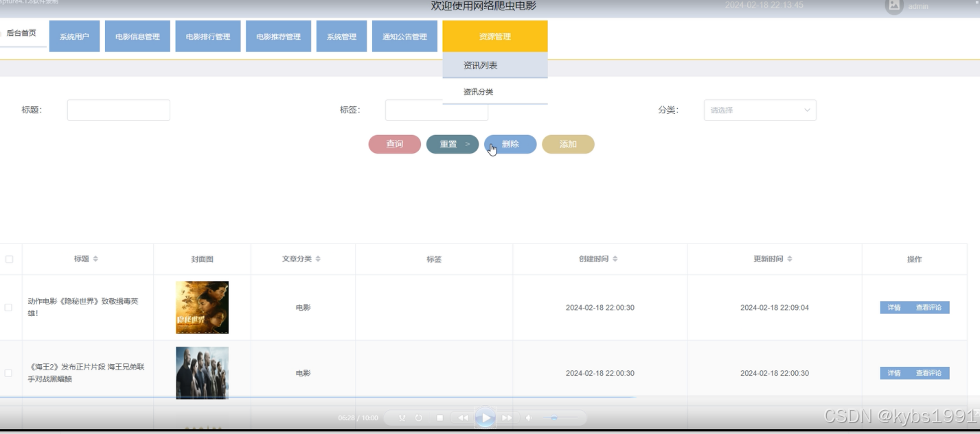 资源管理: 管理电影资讯内容,包括以下功能: