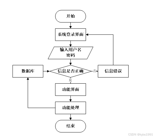用户打开并进入系统后,会先显示登录界面,输入正确的用户名和密码,系统自动检测信息,若信息无误,则用户会进入系统功能界面,进行操作,否则会提示错误无法登录,操作流程如图2-6所示。
