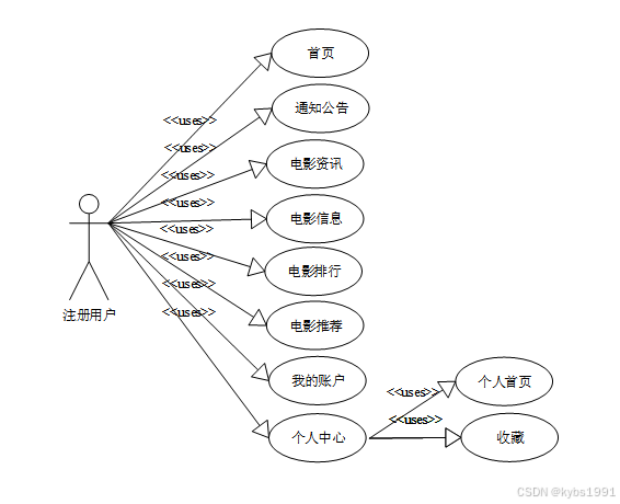网络爬虫电影爬取的设计与实现的完整UML用例图分别是图2-2和图2-3。在参与者上包括注册用户以及管理员。前台上用户角色用例包括用户是注册成为正是会员的用户、有首页、通知公告、电影资讯、电影信息、电影排行、电影推荐、我的账户、个人中心(个人首页、收藏)等功能,注册用户角色用例如图2-2所示。