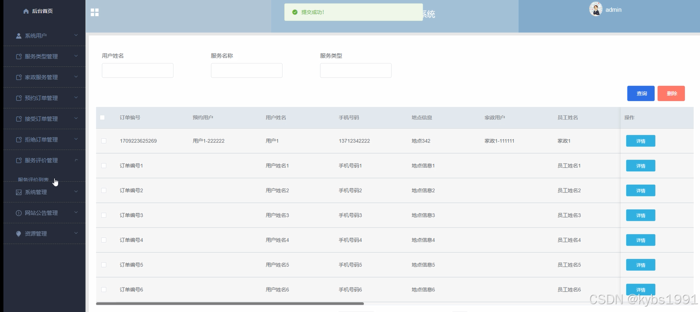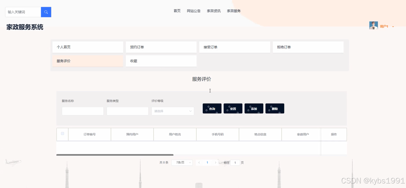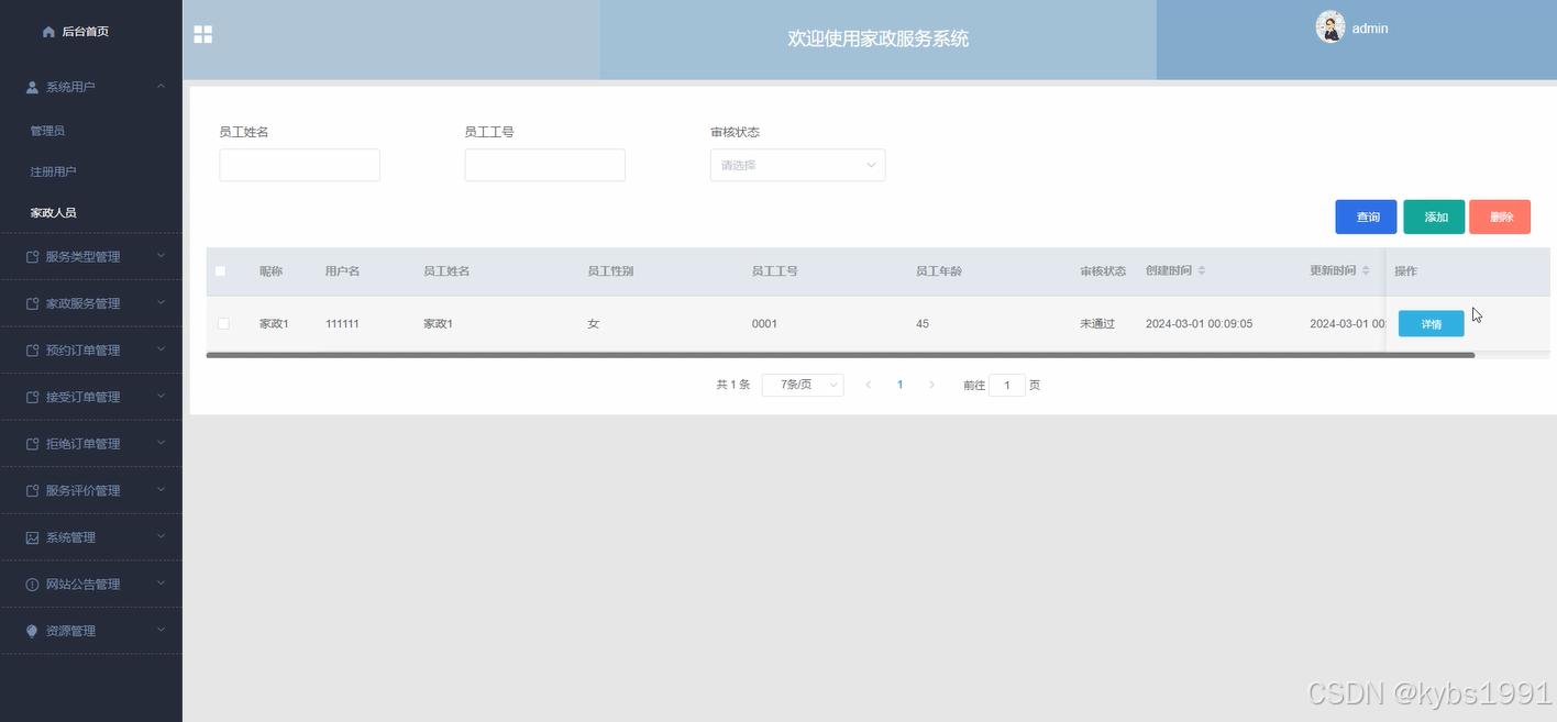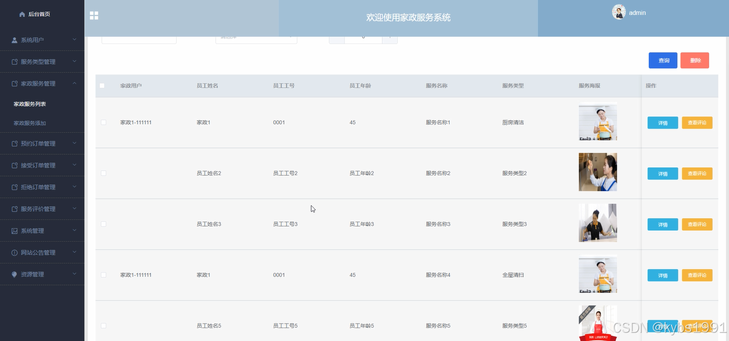 (5)家政服务管理:管理员点击“家政服务”菜单可以对家政服务进行增删改查。