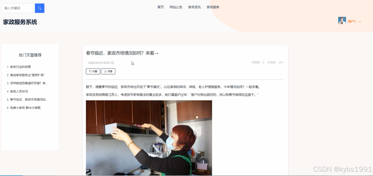 (3)家政资讯:当用户点击“家政资讯”这一菜单按钮,会显示管理员在后台发布的所有的家政资讯,可以查看详情,进行收藏、点赞、评论等;