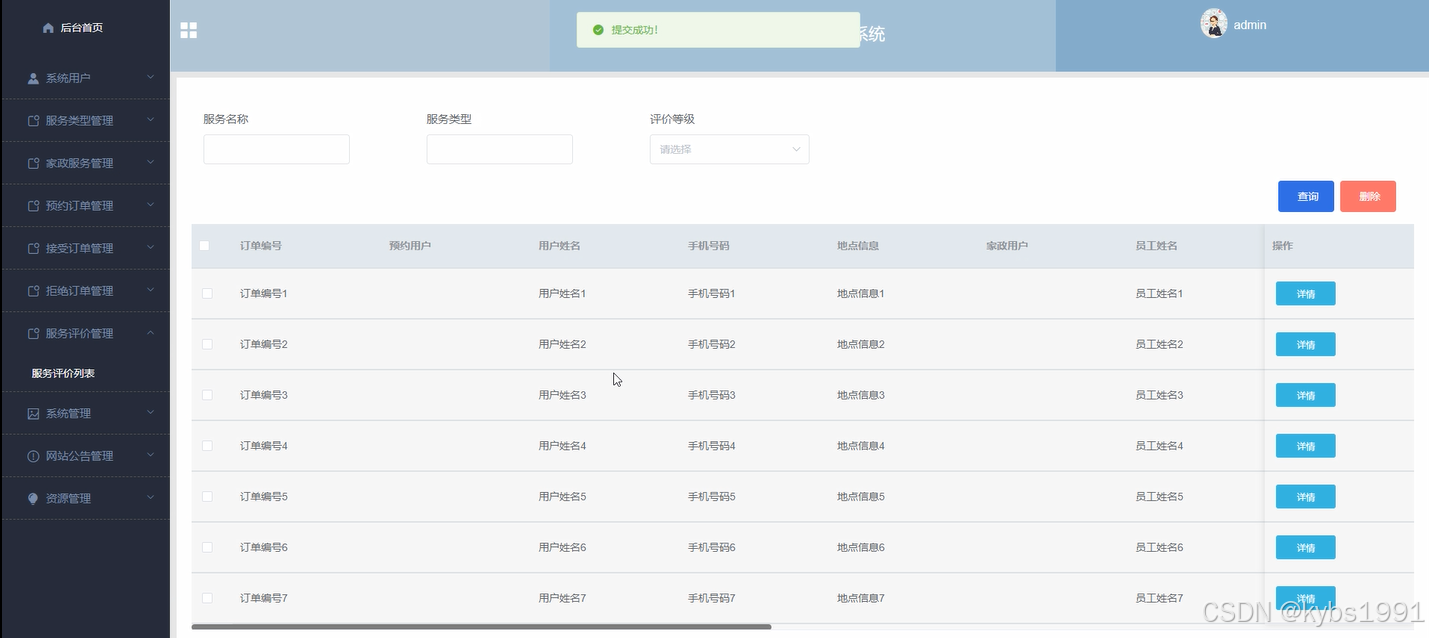 (9)服务评价管理:管理员点击“服务评价”菜单可以对服务评价进行管控。