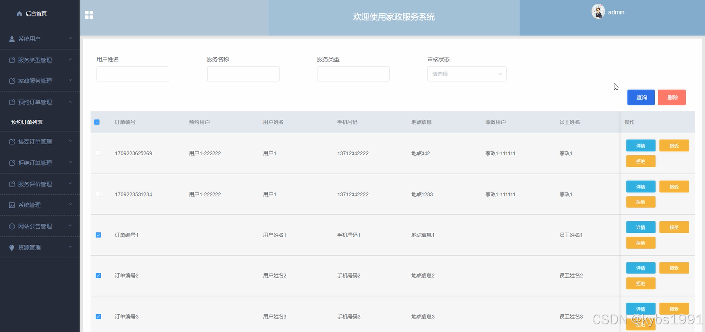 管理员点击“预约订单”会显示出所有的预约订单信息,支持输入用户姓名或者服务名称对预约订单信息进行查询,如果想要添加新的预约订单信息,点击“添加”按钮,输入相关信息,点击“提交”按钮就可以添加了,同时可以选择某一条预约订单信息,点击“删除”进行删除,也可以点击后面的“接受”、“拒绝”按钮对预约订单的接受/拒绝信息进行更新维护。界面如下图4-12所示。