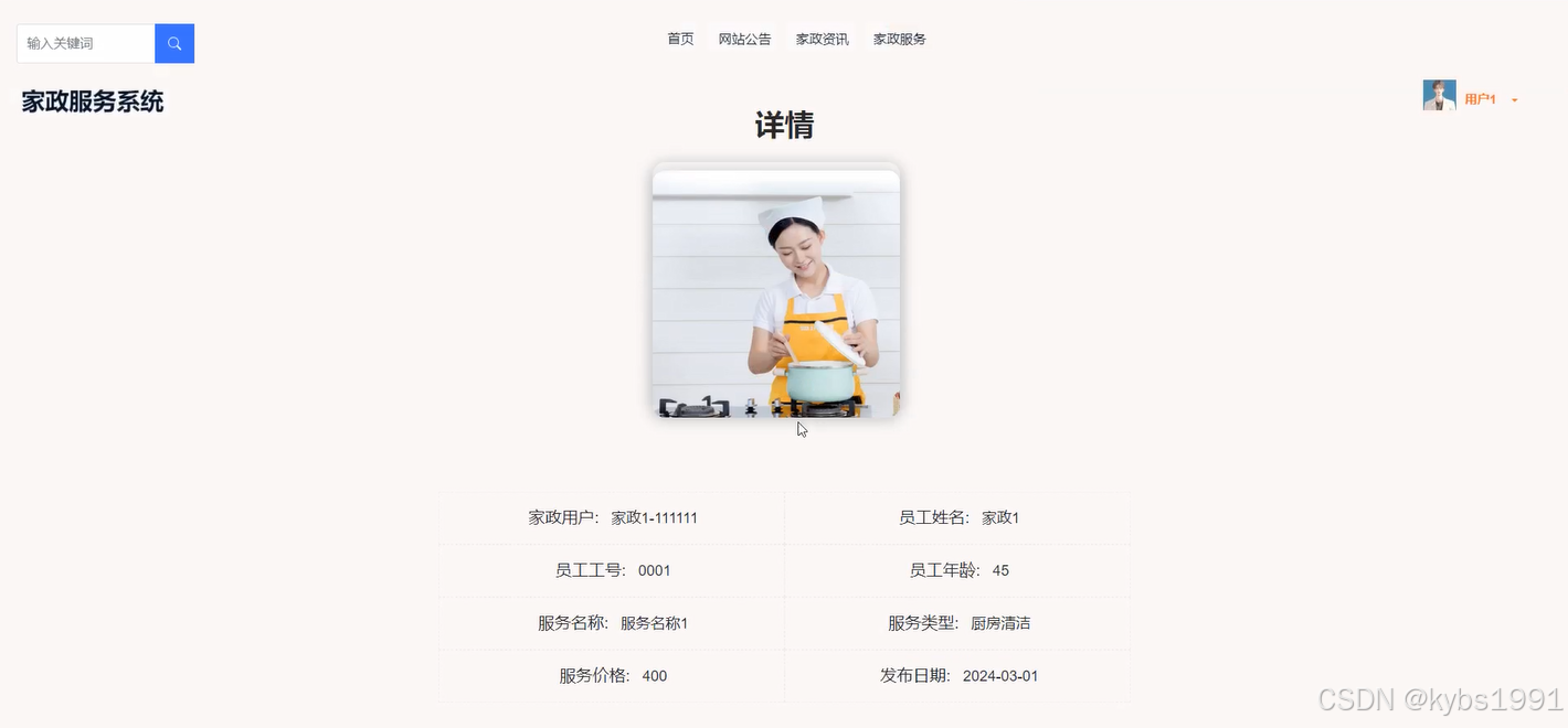 (4)家政服务:当用户点击“家政服务”这一菜单按钮,会显示管理员在后台发布的所有的家政服务,支持通过关键词对家政服务进行搜索,选择需要的家政服务点击可以进入到家政服务详细的介绍界面,在详细界面可以查看到家政服务的家政用户、员工工号、服务价格、员工姓名、员工年龄、服务类型、发布日期等信息,同时可以进行预约、点赞、收藏、评论操作;